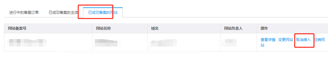 2.找到对应的网站信息,单击【取消接入】按钮
