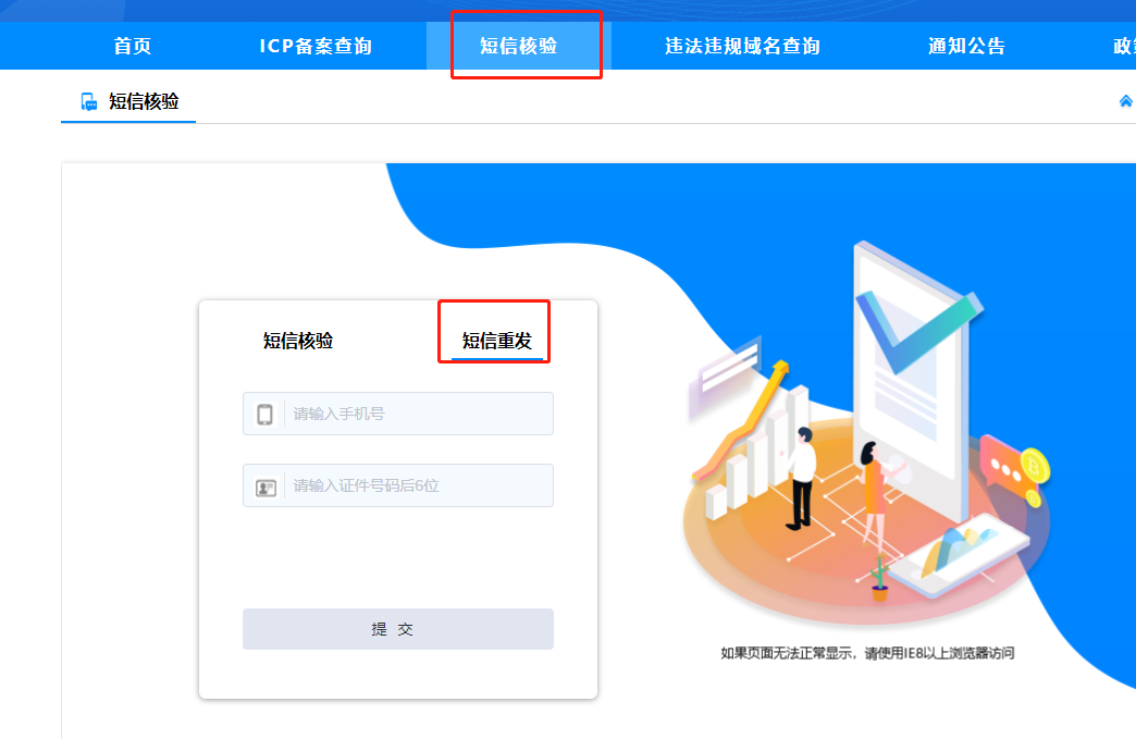 需验证的手机号码收到工信部发出的验证码短信后,请及时登录备案省市管局网站,完成短信验证。