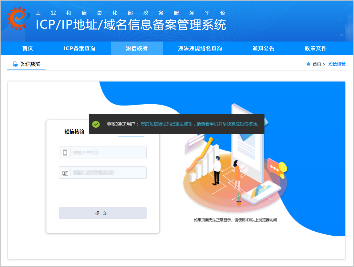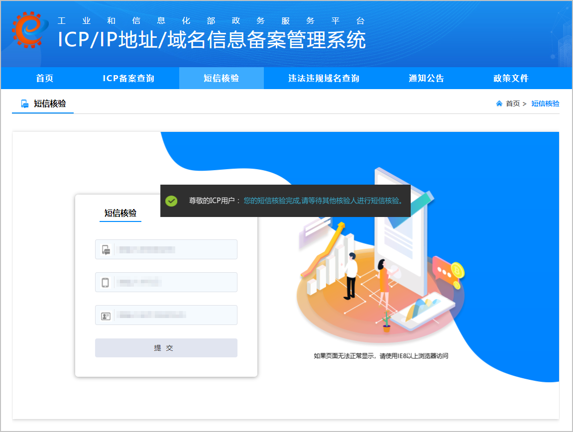 您需在收到核验短信的24小时内,访问备案所在省份的通信管理局网站进行验证。手机短信验证通过后,您的备案信息将流转至管局审核。