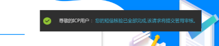 如系统提示您的短信核验完成,请等待其他核验人进行短信核验,说明您的备案订单中还有其他需验证的手机号码,请联系其他负责人及时完成核验。如超过24小时未核验,工信部系统将会驳回您的备案订单.
