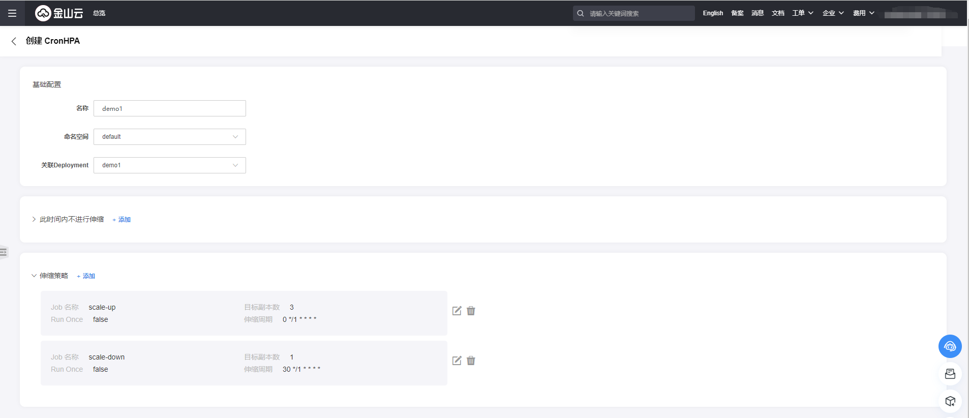 进入自动伸缩-CronHPA页面,为已有工作负载创建CronHPA规则;deployment-demo在每分钟第0秒将副本数调为3,在每分钟第30秒将副本数调为1