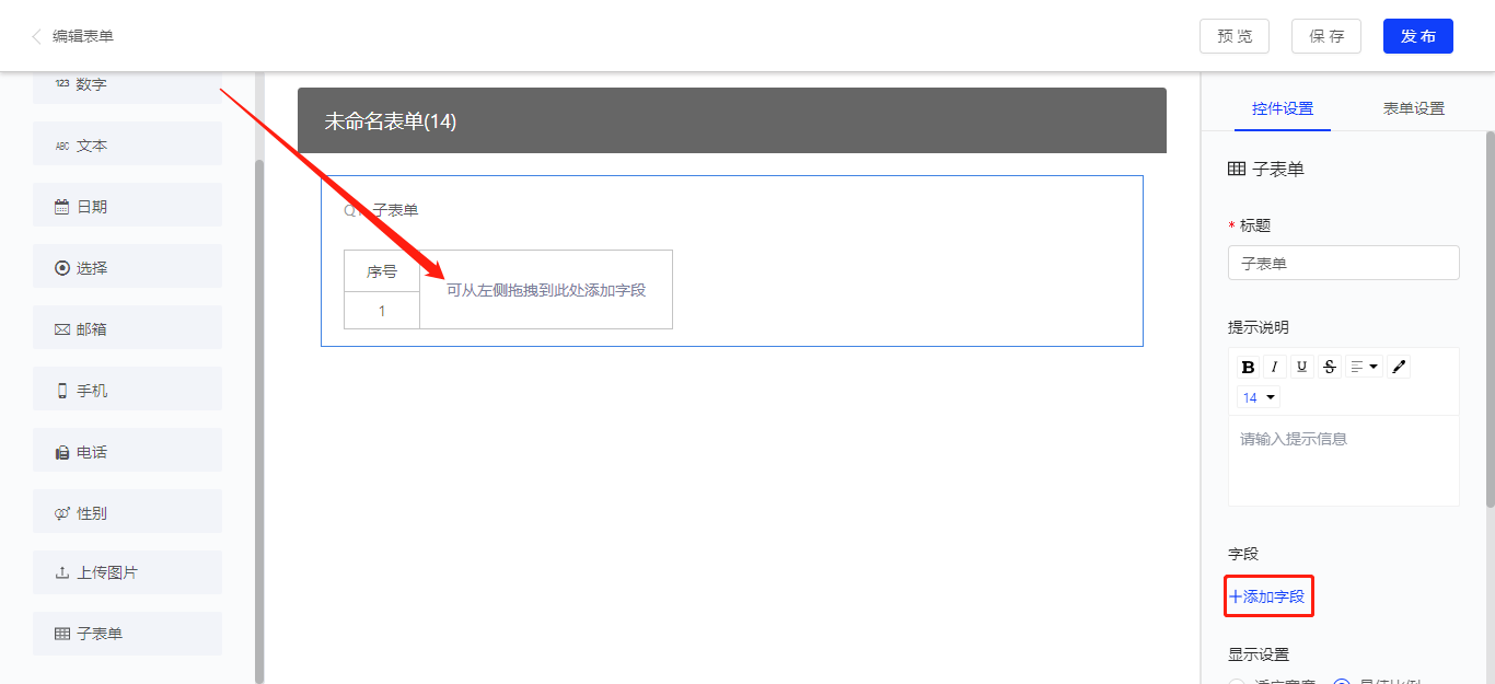 点击“添加字段”,可以选择相应的字段添加至子表单处,也可以从左侧直接拖入字段