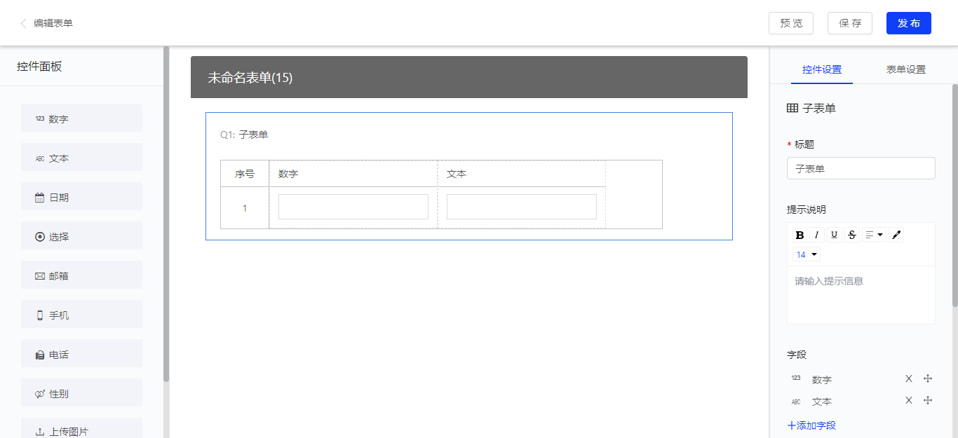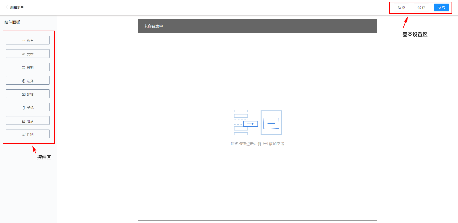页面左侧栏是平台提供的各项控件,单击或者拖拽需要的控件便可添加进表单。页面右上栏是表单基本设置区,可以预览、保存和发布表单。