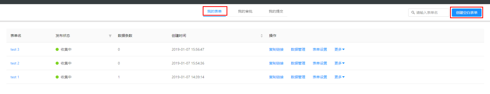 进入表单系统后,页面会显示所有已创建的表单。点击创建空白表单即可进入新表单的编辑界面。
