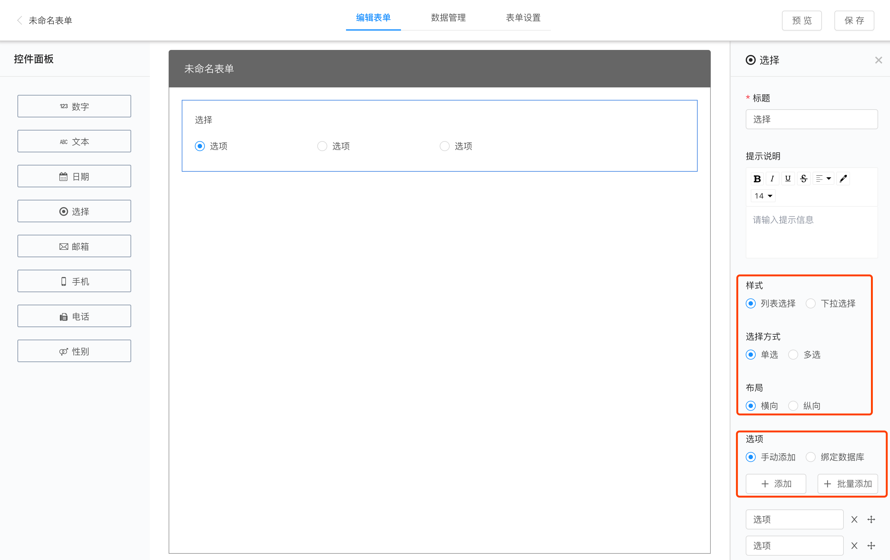 选择控件下的控件配置区可以调整样式和布局。其中列表选择样式下可以样式为列表或者下拉,选择方式为单选或者多选,设置布局为横向或者纵向。选项支持手动添加、批量添加和数据库导入。