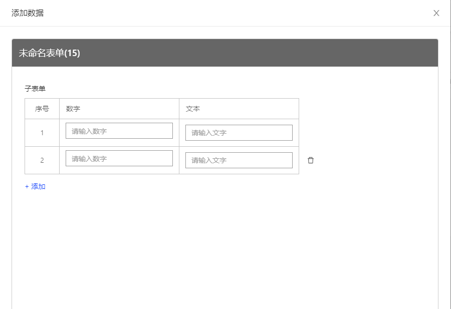 设置子表单所需字段后,填写表单时,点击子表单下方的“添加”按钮,可以增加行。
