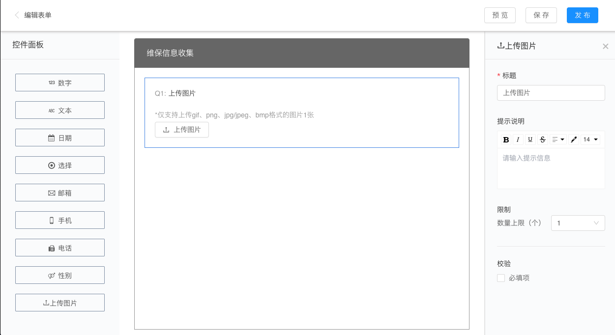 图片控件支持用户上传图片,控件设置支持设置标题、提示说明、限制、校验。