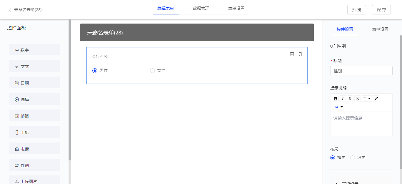 创建者需要搜集性别类型的数据时选用“性别”控件,在控件设置处可以设置标题、提示说明、布局。