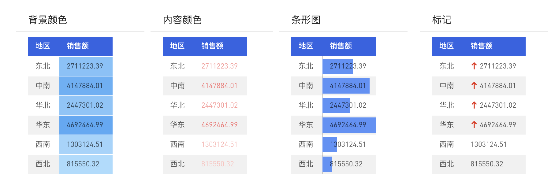 表格控件支持4种条件格式的设置:背景颜色、内容颜色、条形图、标记。4种条件格式的效果如图所示,可以叠加: