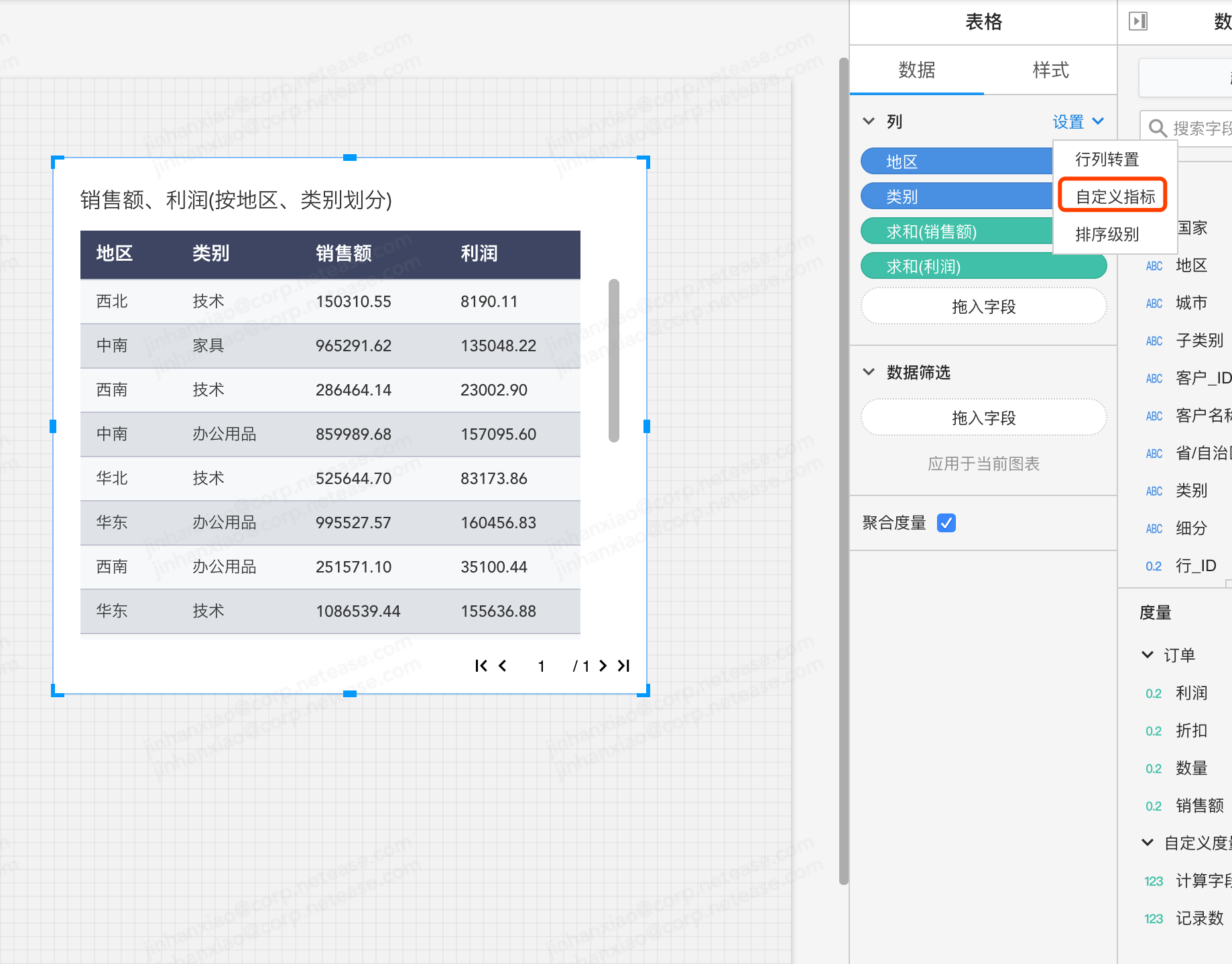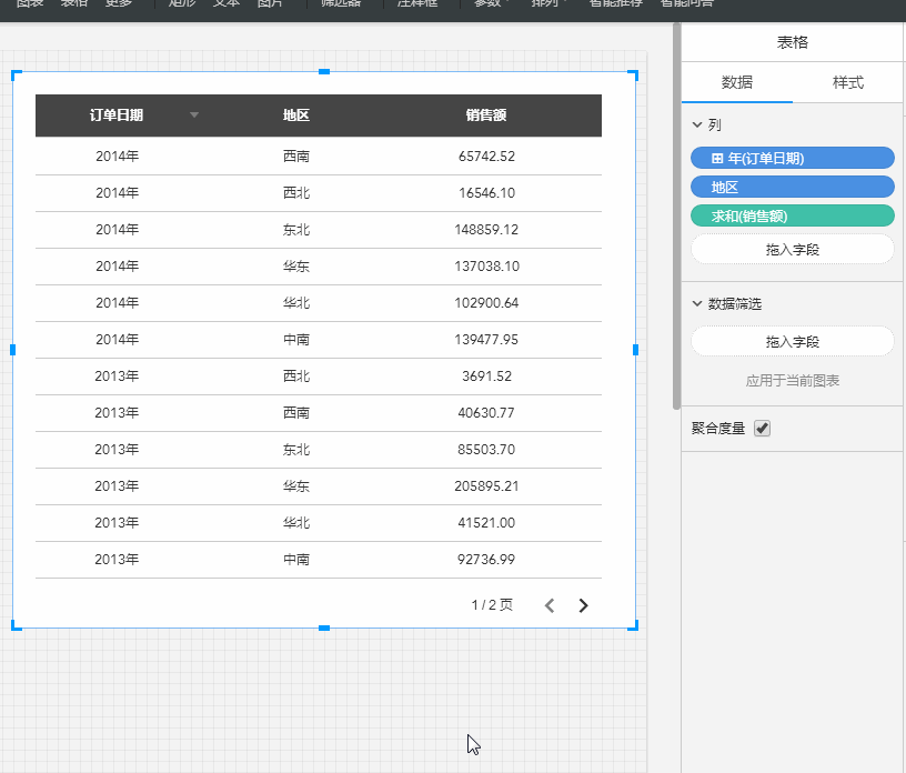 2.在表格的数据面板,列依次放置维度订单日期,维度地区,度量利润,度量数量。