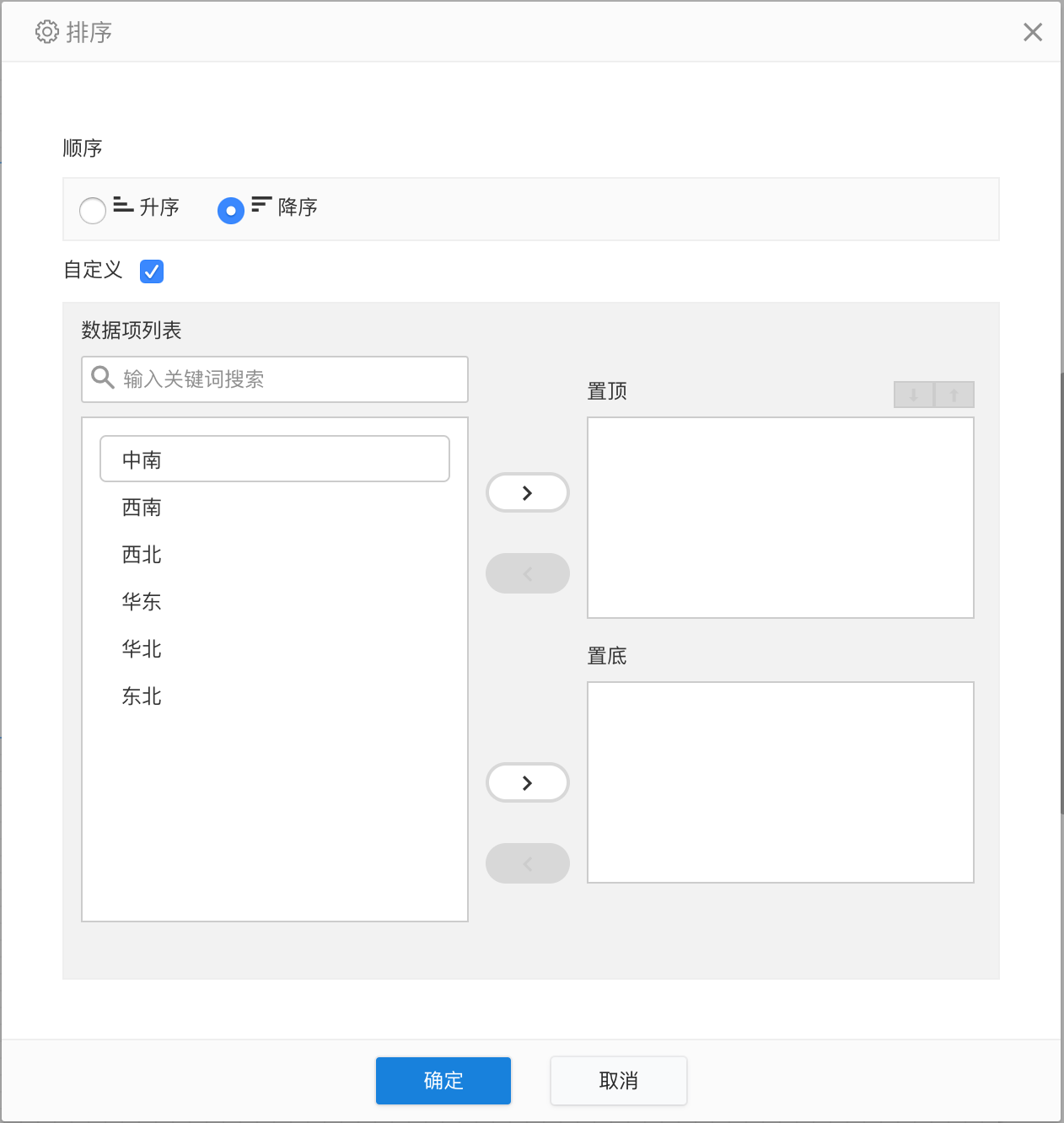 在呼出的排序设置窗口中勾选自定义,允许对维度的各数据项进行自定义的置顶/置底排序。