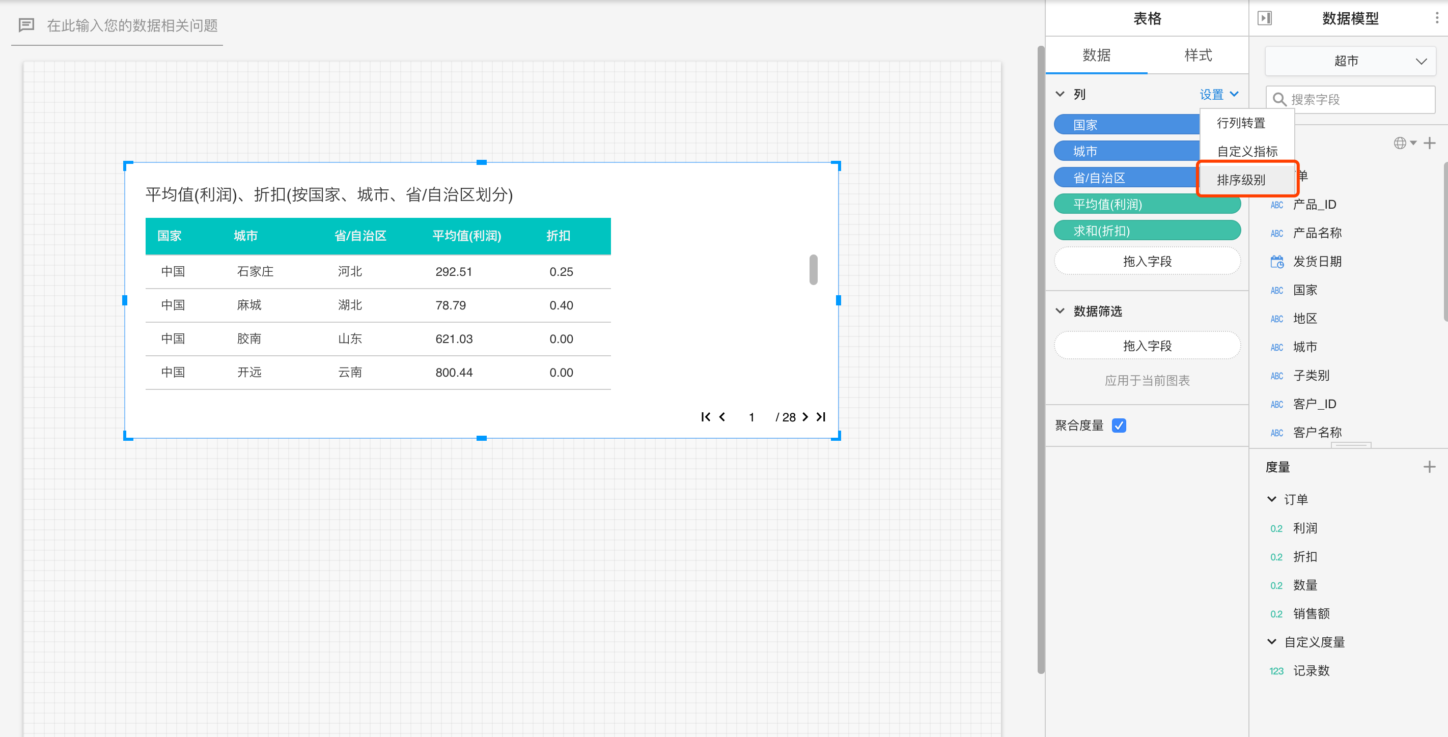 排序级别里提供【对所有未排序字段进行排序】功能,点击升序或降序后,将对所有字段都执行排序。执行过排序的字段将排列在下方,默认级别顺序按照数据面板上的字段顺序排列,也可对字段进行单独的排序设置。