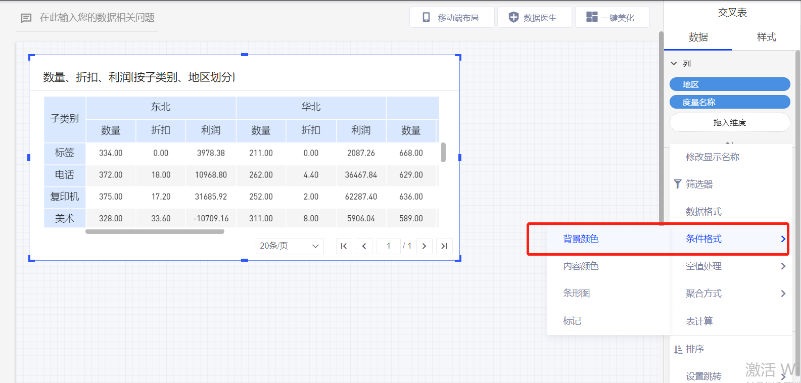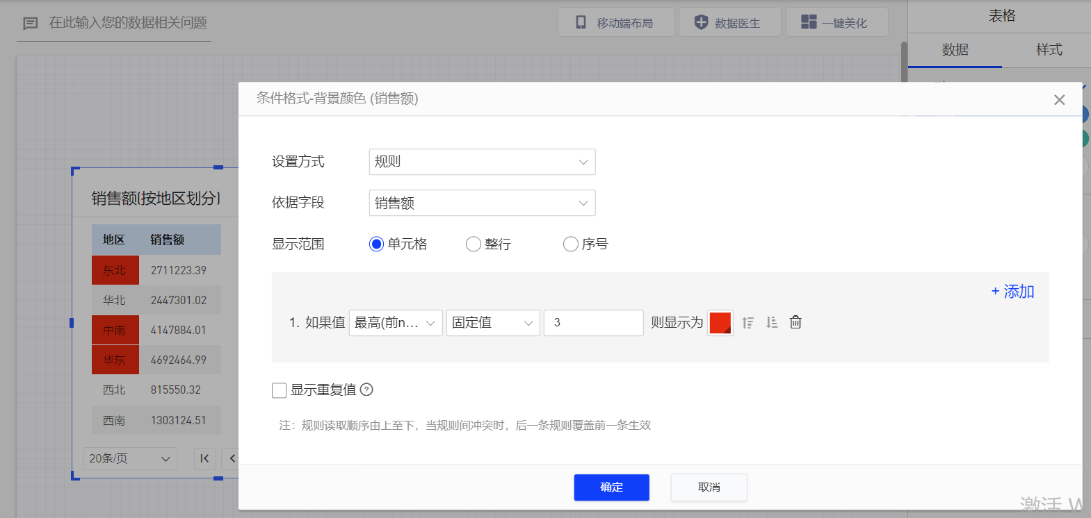 1、依据字段:当前字段可以依据其他字段的值来显示条件格式。例如地区字段可以依据销售额大小来显示条件格式,将销售额大于10000的地区字段标红。