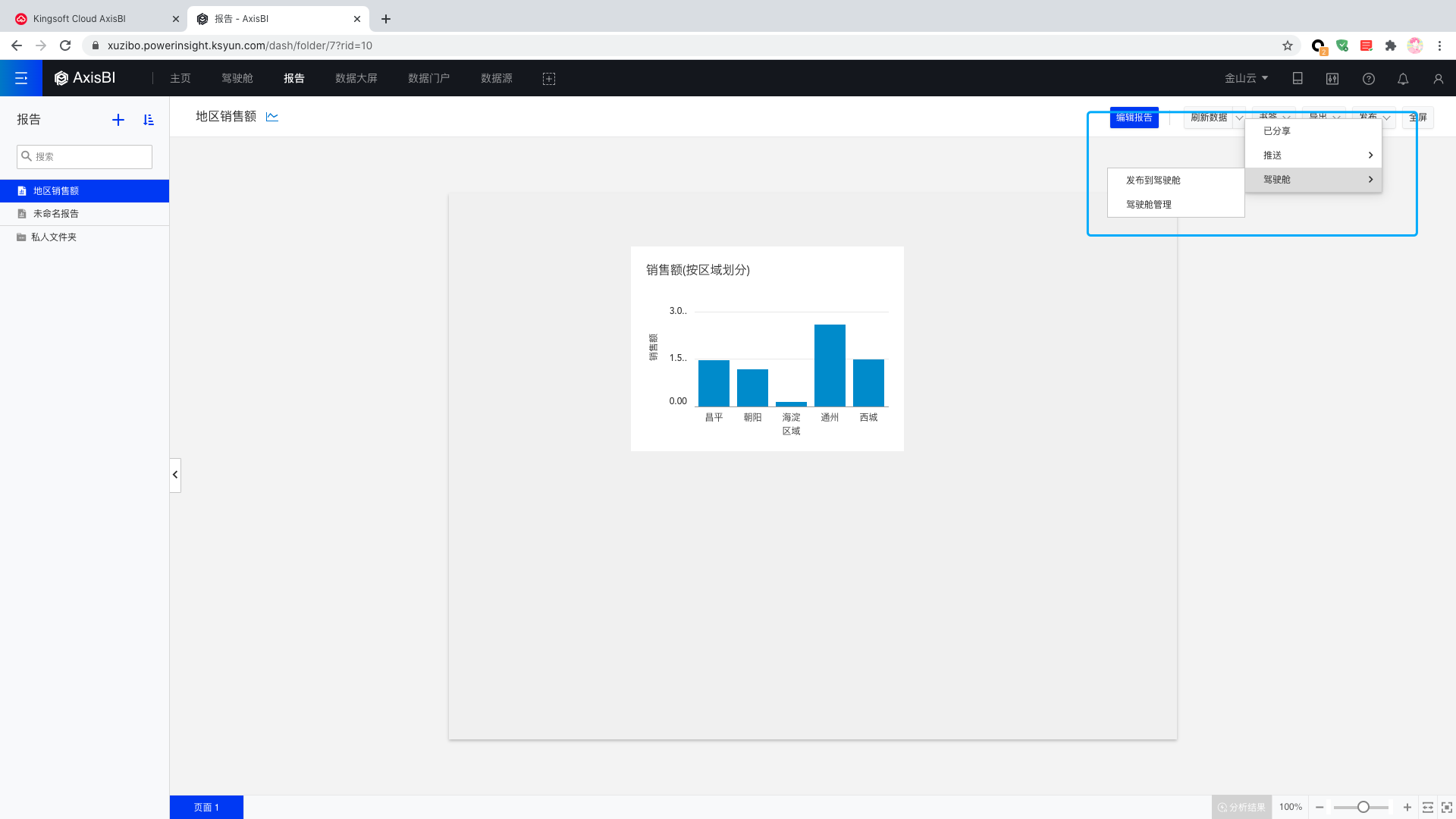 发布到驾驶仓: 在任意报告的阅览状态下,单击页面右上角的驾驶舱图标,选择发布到驾驶舱菜单项。