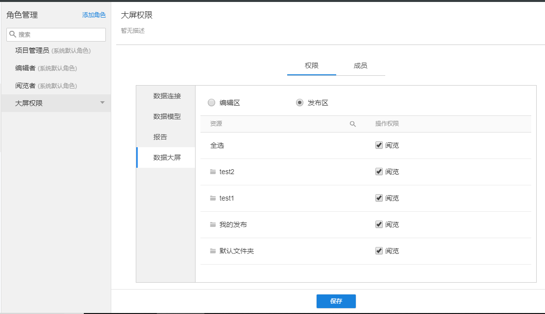 2.如果只在权限管理的发布区对角色选择了阅览权限,则角色的操作权限只有阅览文件夹下大屏,大屏发布页面没有去编辑按钮;