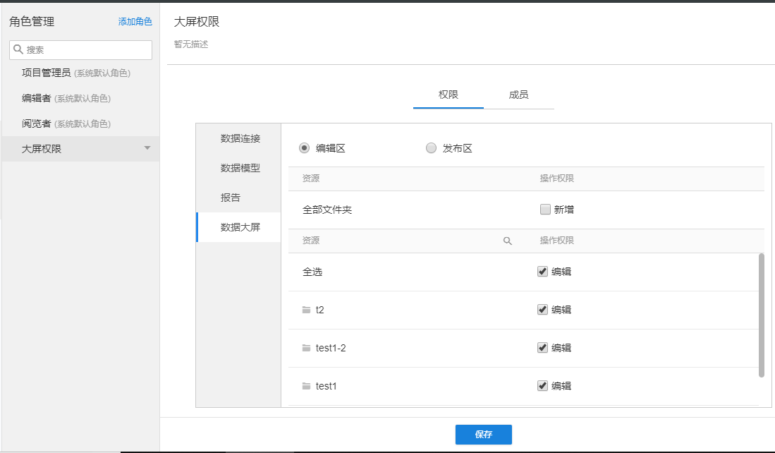 1.如果在权限管理的编辑区对角色选择可编辑大屏,则对应的发布区大屏可被对应角色阅览,权限界面上无反馈,但大屏发布页面有去编辑按钮;