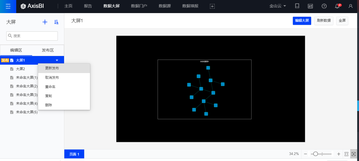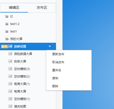 在编辑区右键已发布的大屏,点击取消发布。