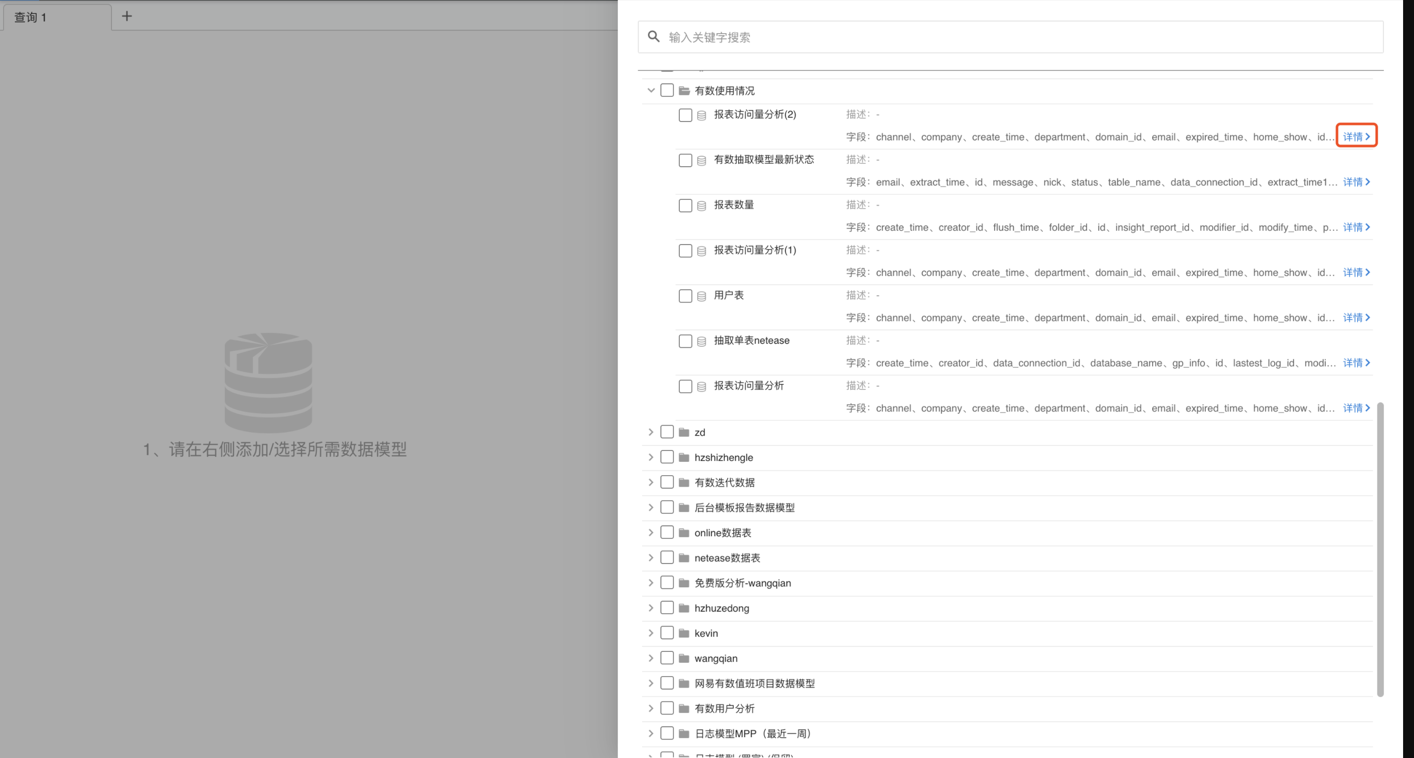 点击【添加数据模型】,进入模型列表,按照文件夹-数据模型的列表样式展示了有查询权限的模型,可通过模型描述和详情选择是否为所需模型;