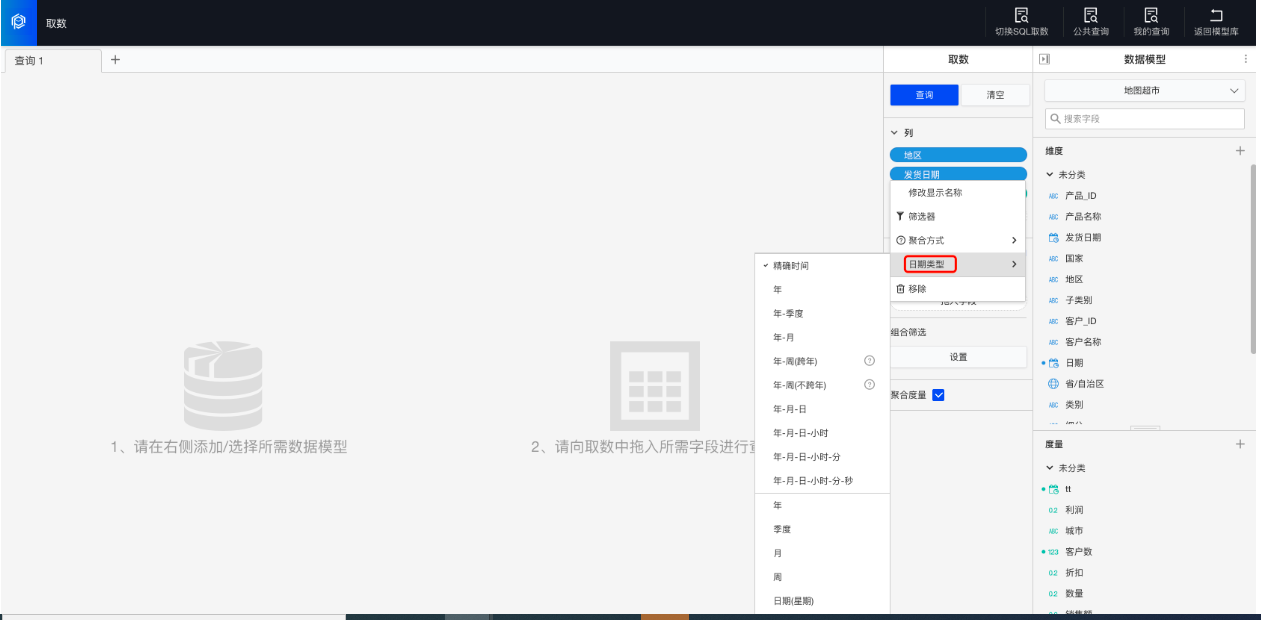 日期类型的字段:可快速切换字段类型,选择年、季度、月、日、小时等不同时间粒度,快速查看不同时间粒度的数据: