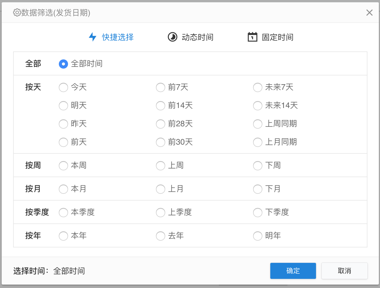 快捷选择可快速选择今天、昨天、本周、上周、本月、上月、本季度、上季度、本年、上年等常用的时间维度: