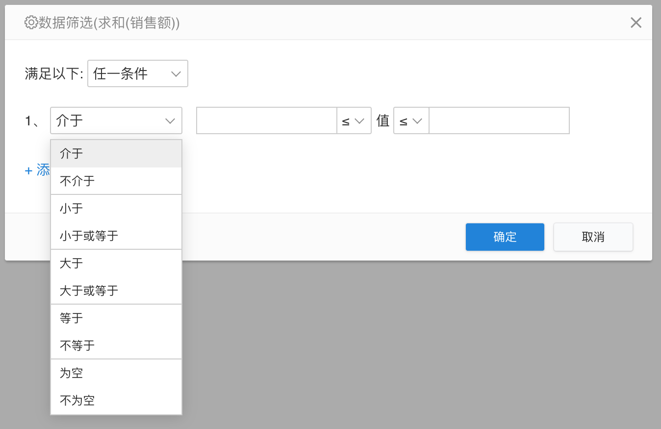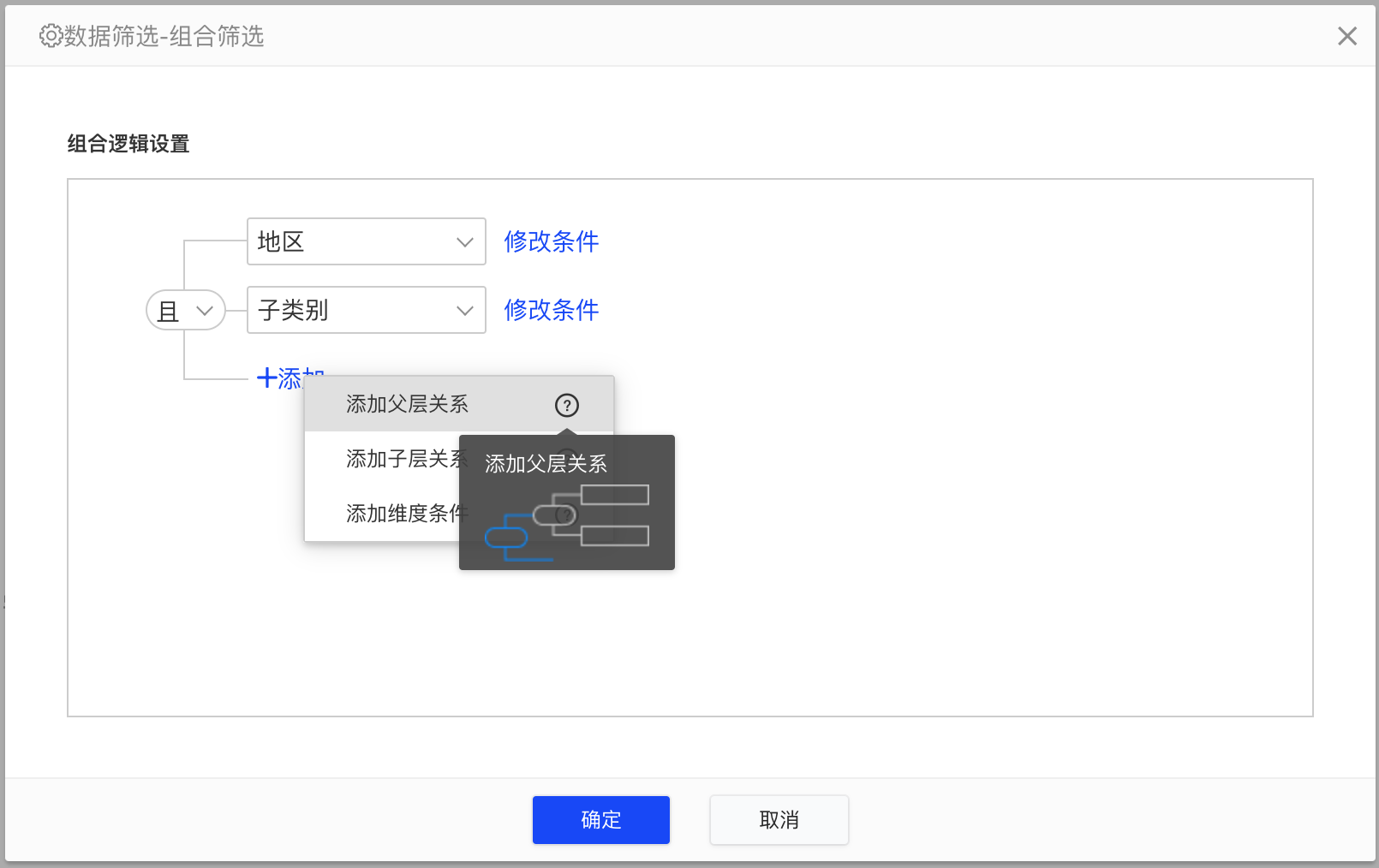 组合筛选采取树状编辑:基于该节点添加父层关系、子层关系、维度条件;