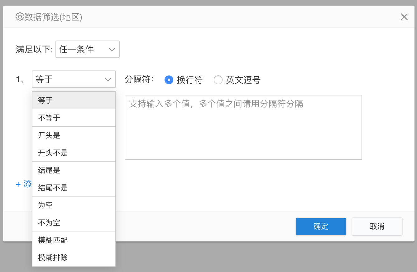 对于不同类型的字段有不同的筛选方式,场景的三种字段类型的筛选: