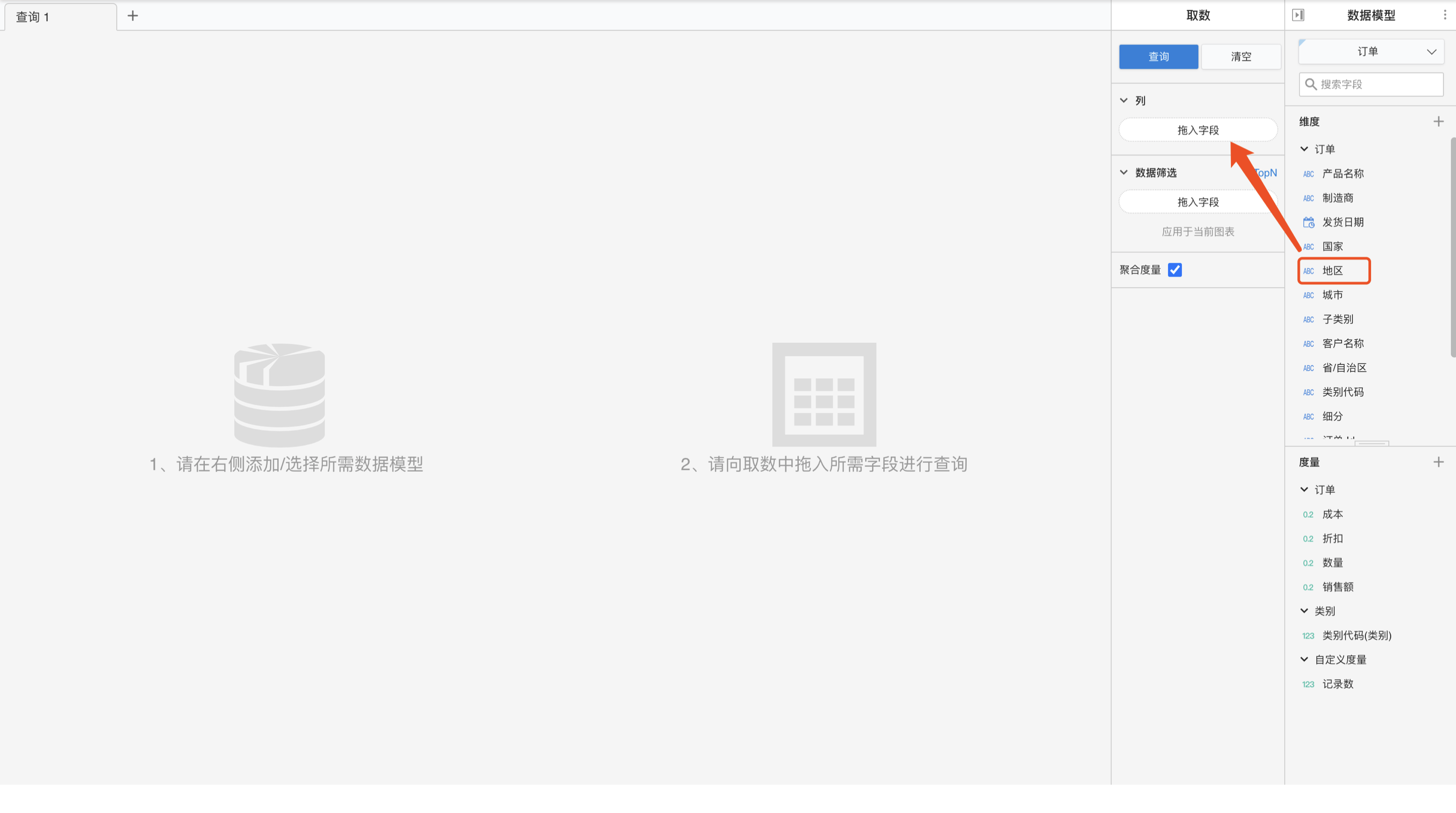 双击数据模型列表的字段即自动添加该字段到查询面板,也可以手动拖拽所需字段到查询面板: