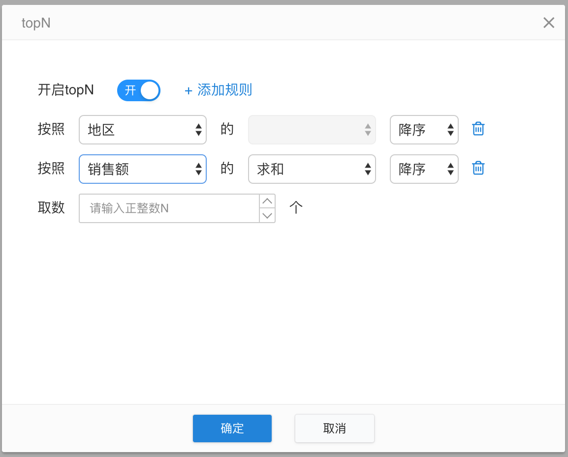 添加规则后,可选择将查询数据的升序降序作为排序,筛选满足条件的前N条数据,且TopN筛选支持设置优先筛选,勾选后优先筛选当前满足排序条件的topN数据,再进行其它筛选:
