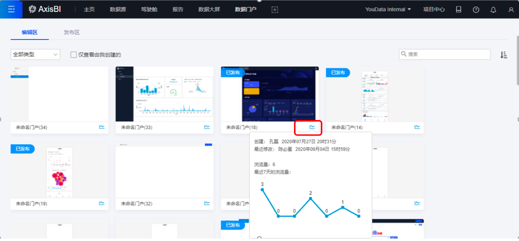 点击门户缩略图的右下角,可以查看该数据门户的创建与最近修改信息,以及门户的浏览量
