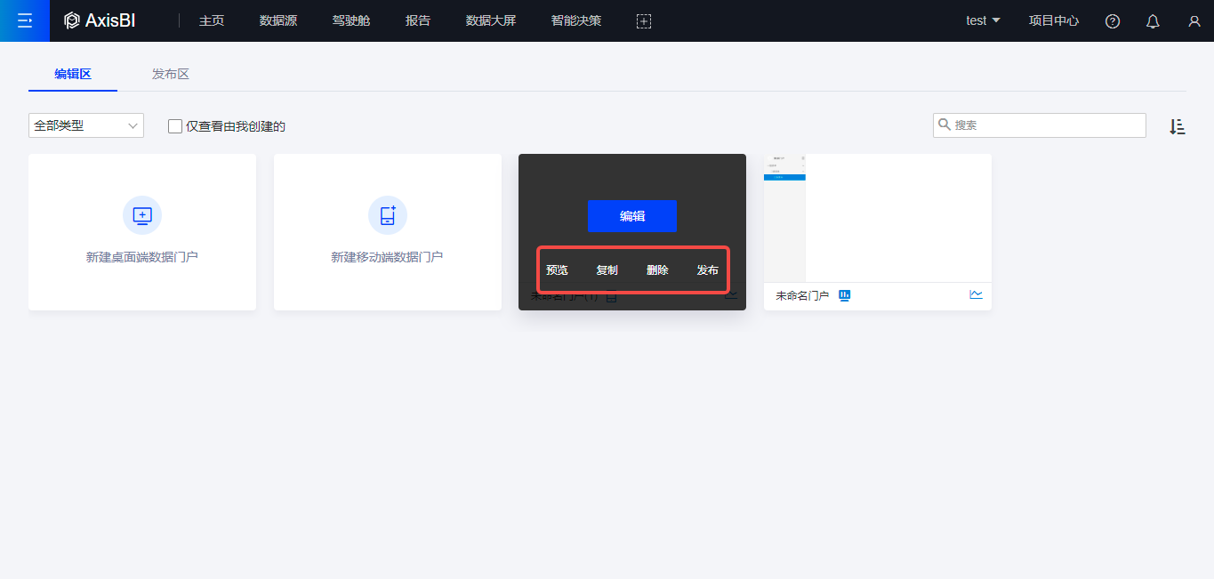 你可以在数据门户列表中实现数据门户的预览、编辑、复制以及发布