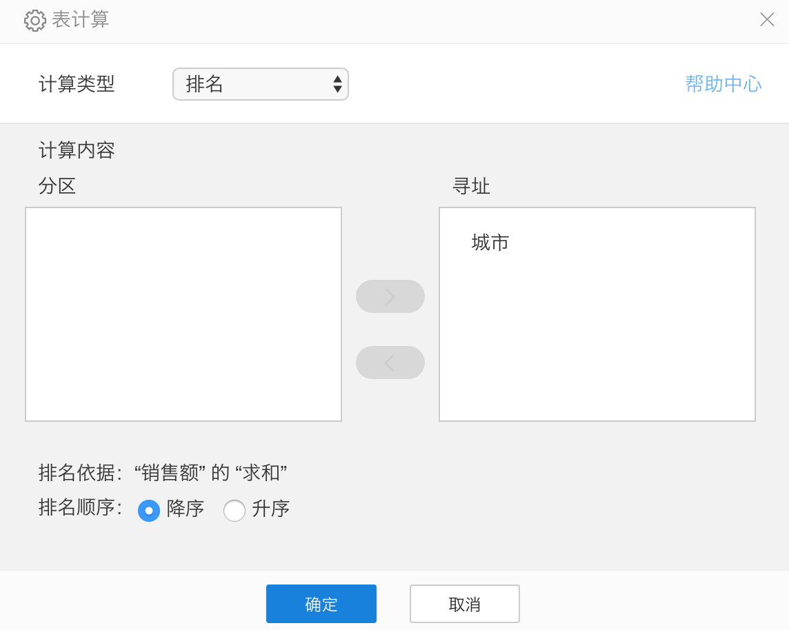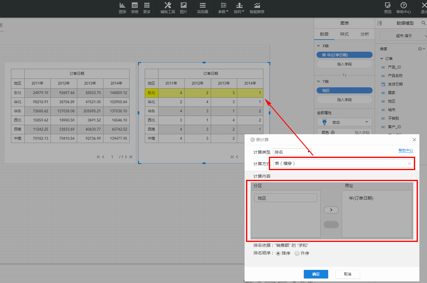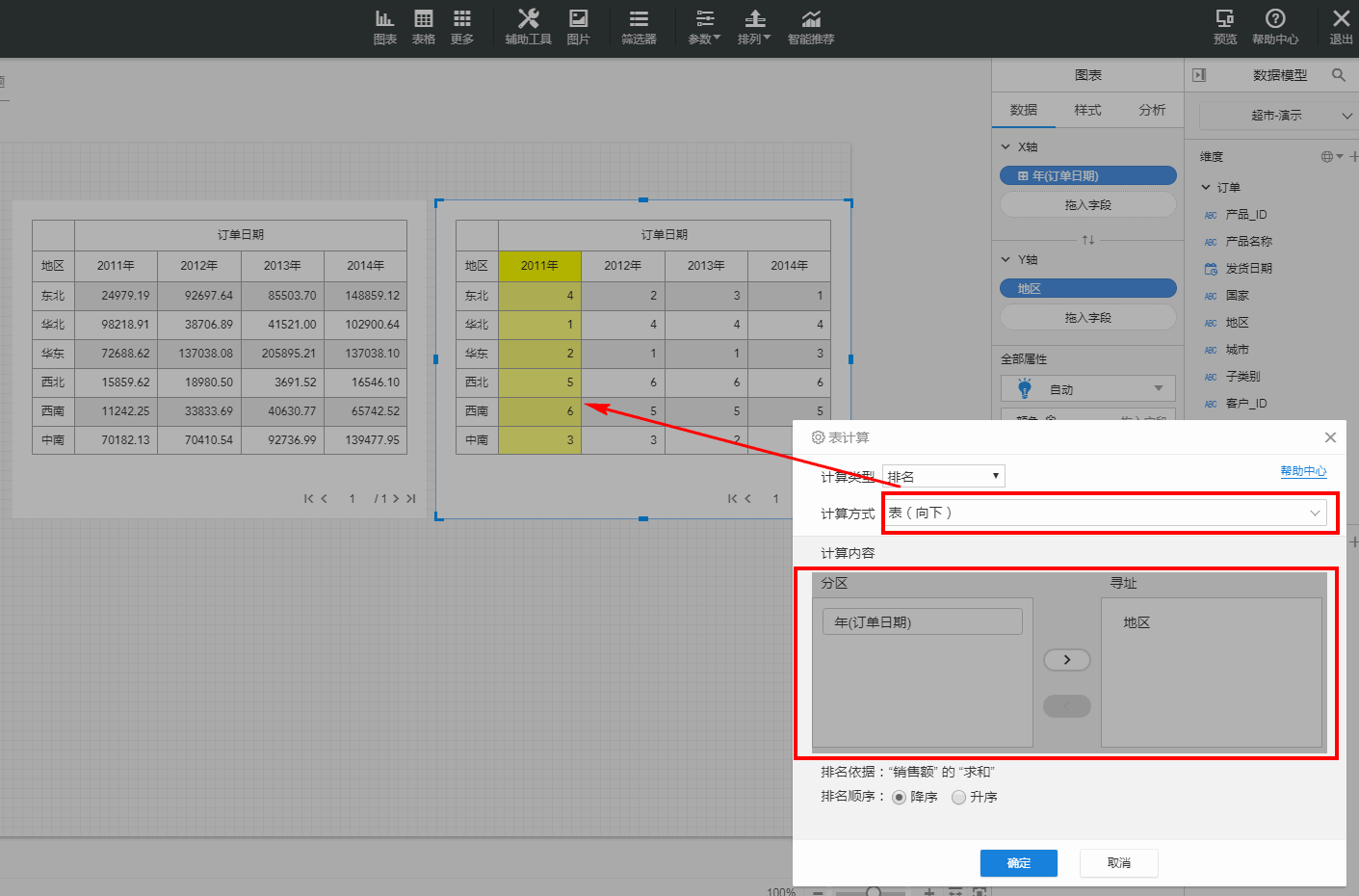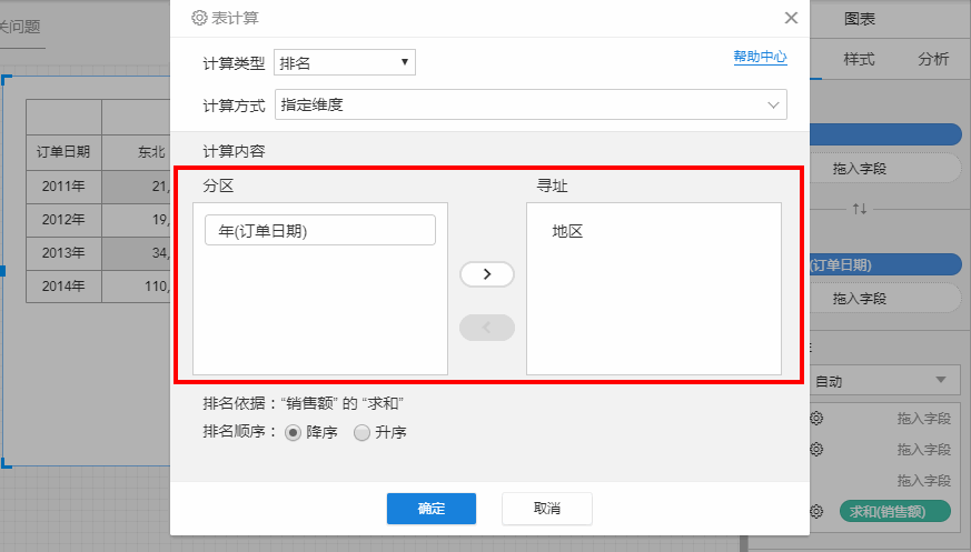 分区为表计算划定范围,寻址为表计算指定方向。比如我们需要在对每年的地区进行排名,分区就是年,寻址是地区。