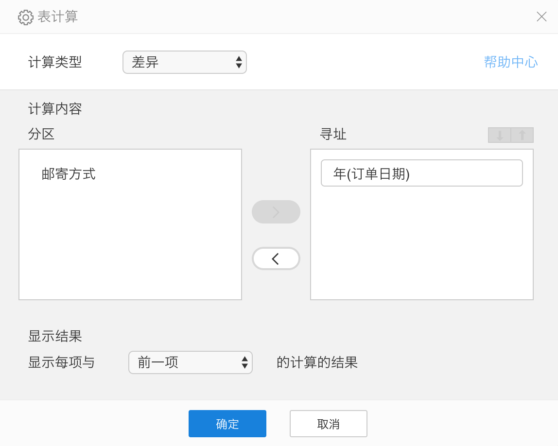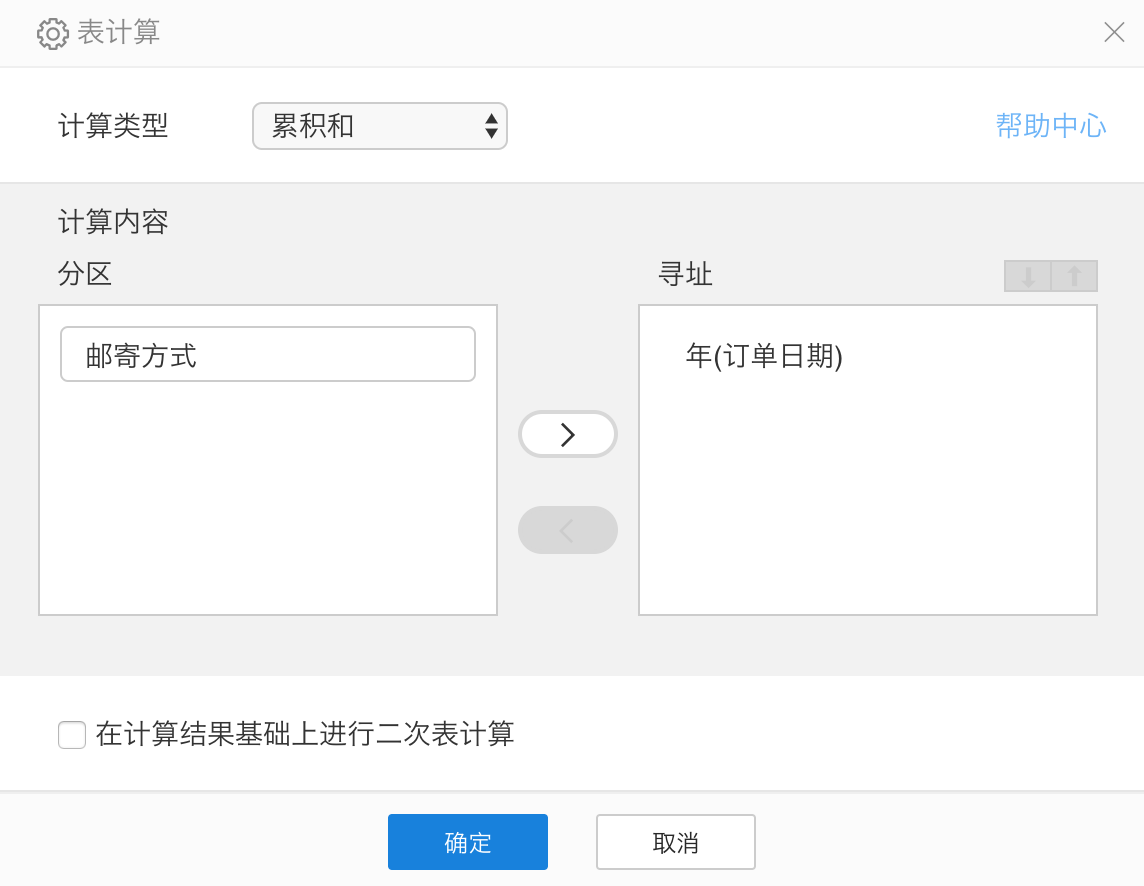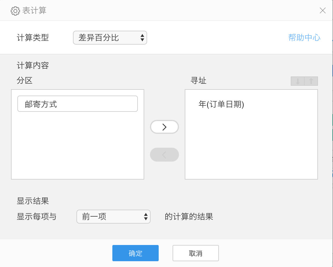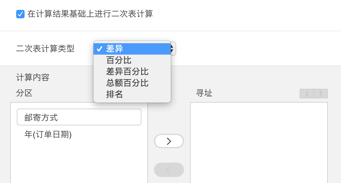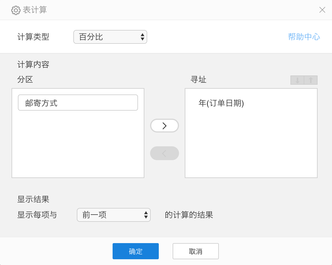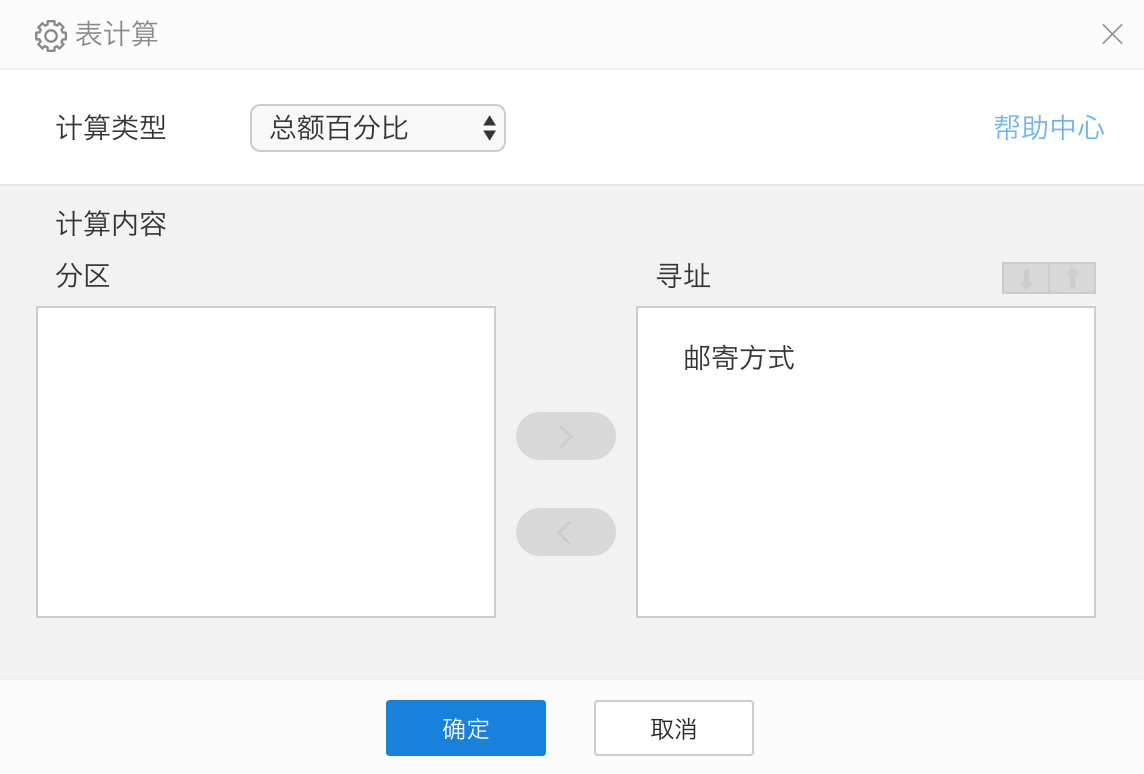 计算内容是决定当前视图中,哪些维度用来分区计算,哪些用来在区分好的组里面按照顺序做计算。这里,总额百分比并没有前后的概念所以寻址的顺序不影响结果,寻址中的邮寄方式代表着我们计算每个邮寄方式占所有邮寄方式总额的百分比。如上图中配置,以及当前面板的配置