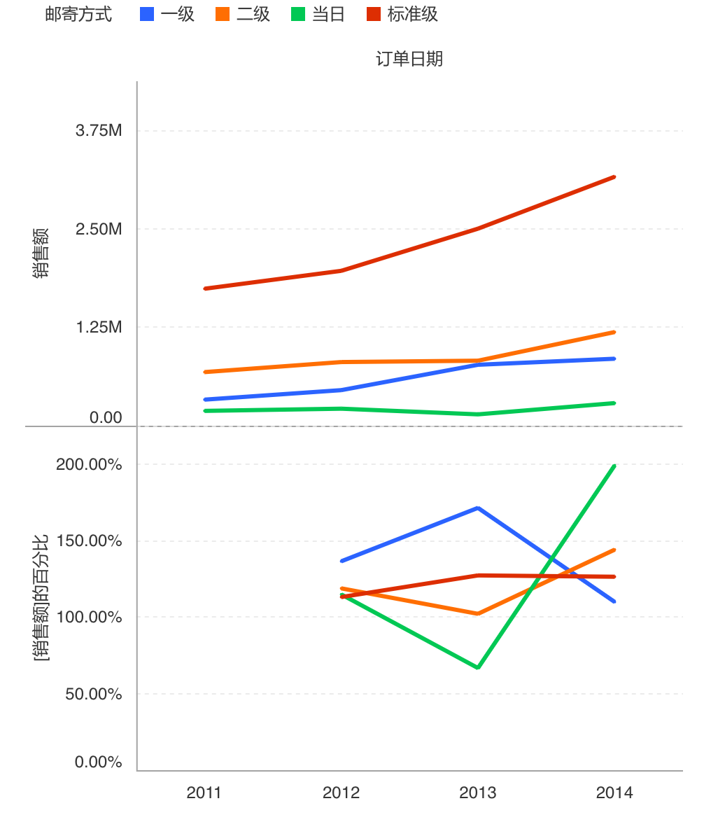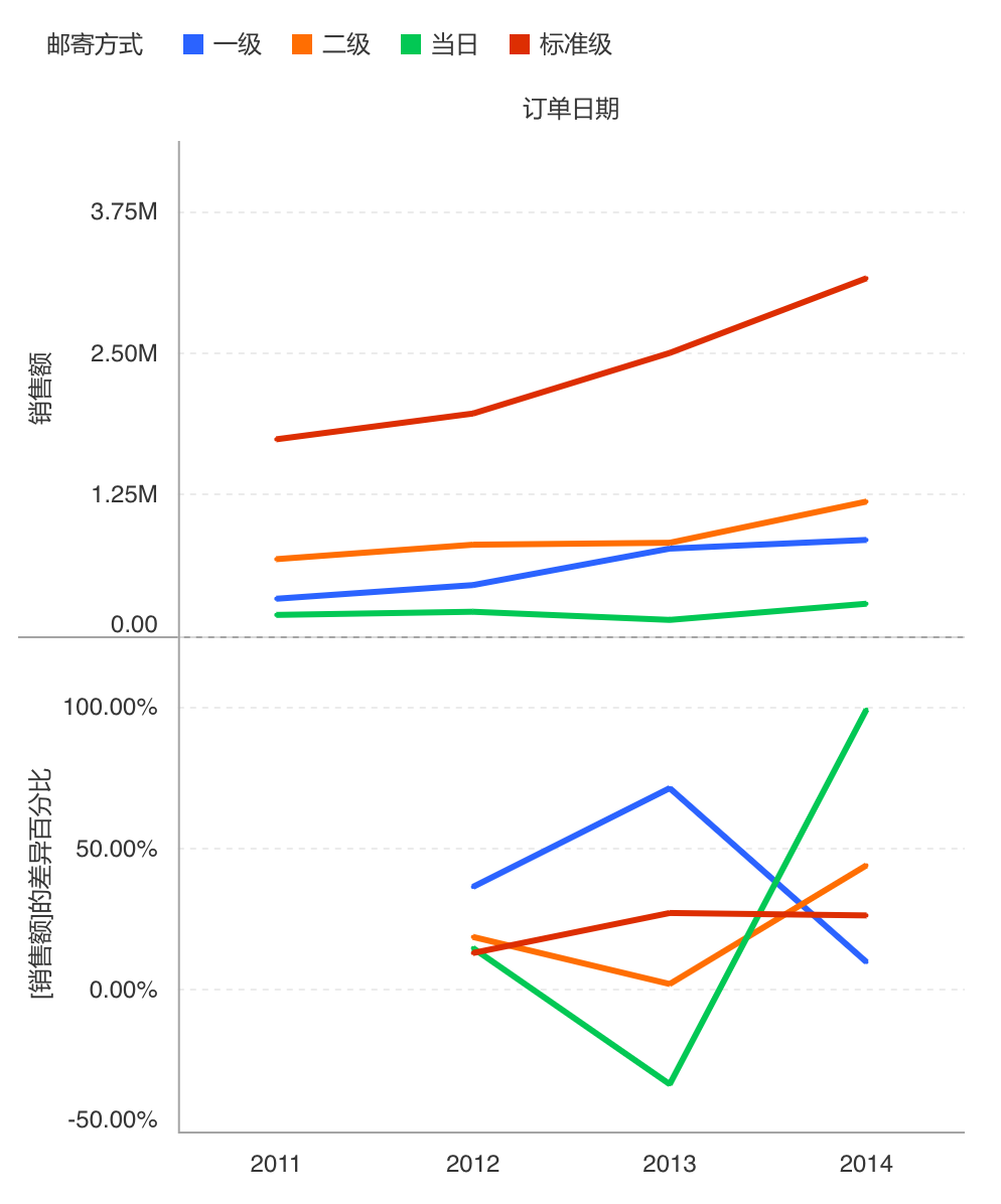 我们根据邮寄方式划分了四个小组分别作差异计算,在每个分组中沿着年(订单日期)中的2011 2012 2013 2014 按顺序计算与前一项的百分比。