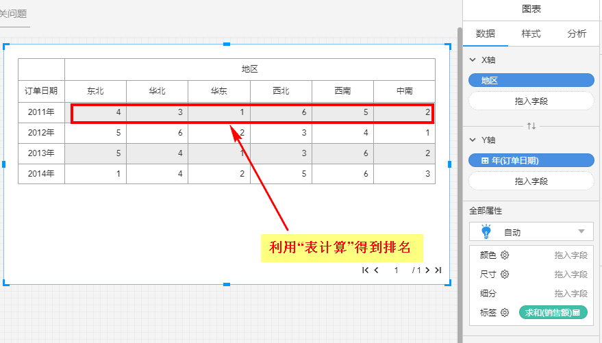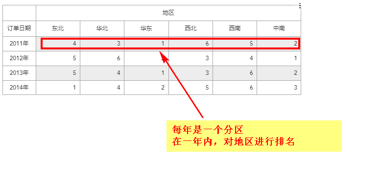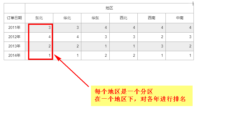 如果我们对调一下,把地区变为分区,年变为寻址,那么我们得到的就是每个地区下各年的销售额排名,如下图所示: