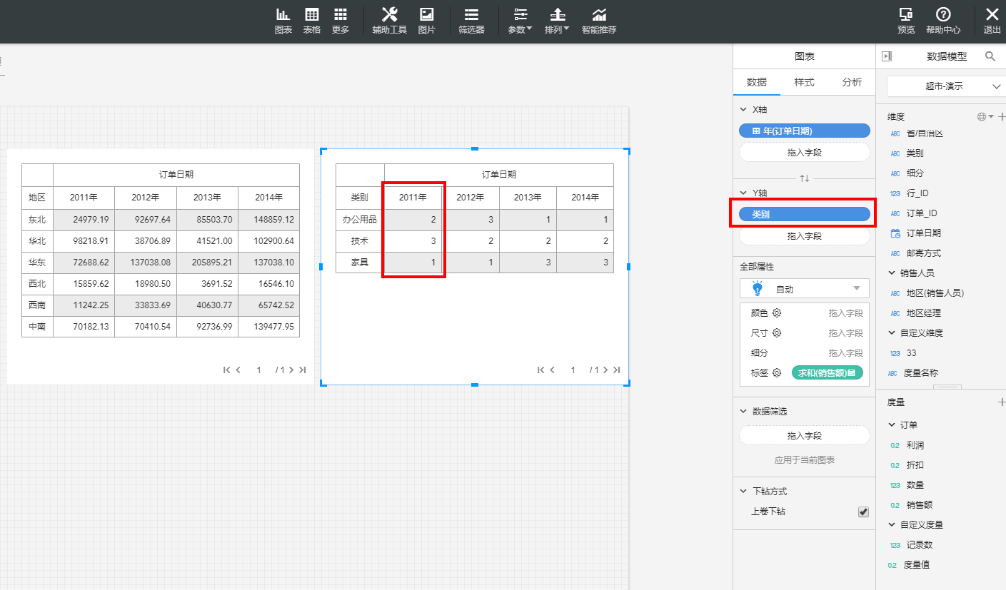 因为动态表计算不需要指定具体的维度,所以当图表的字段发生变更时,会自动根据新的字段进行计算,比如,用“类别”字段替换掉“地区”字段,则会自动按照新的字段进行表计算,计算各类别的排名。