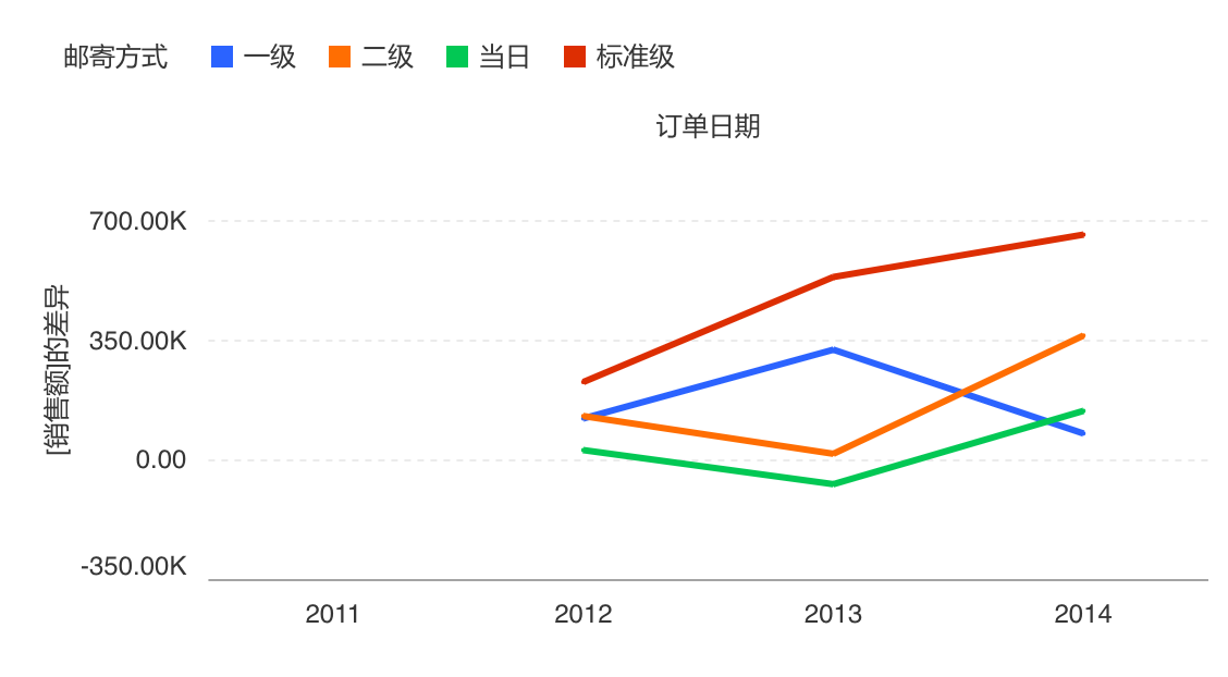 我们根据邮寄方式划分了四个小组分别作差异计算,在每个分组中沿着年(订单日期)中的2011 2012 2013 2014 按顺序计算与前一项的差异。
