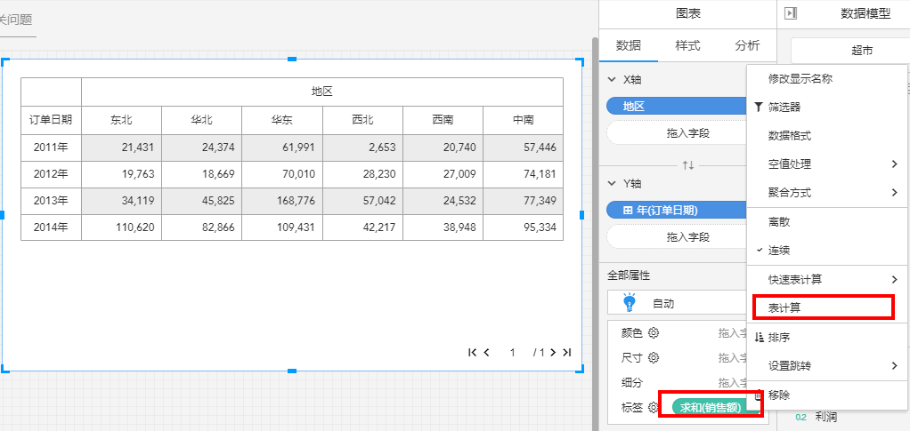 如要计算“销售额”的移动计算,首先需要把要计算的“销售额”胶囊拖拽到左边的面板上,并点击小三角找到表计算菜单选项(如下图):