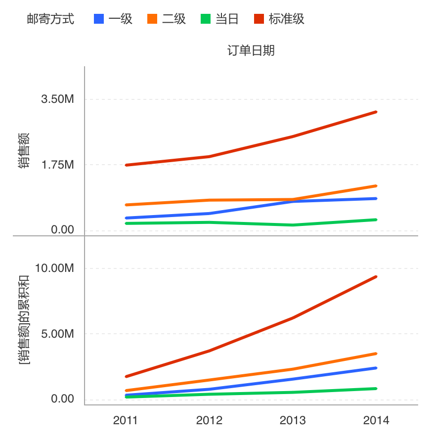 我们根据邮寄方式划分了四个小组分别作累积和计算,在每个分组中沿着年(订单日期)中的2011 2012 2013 2014 按顺序计算与其前面所有值的和。