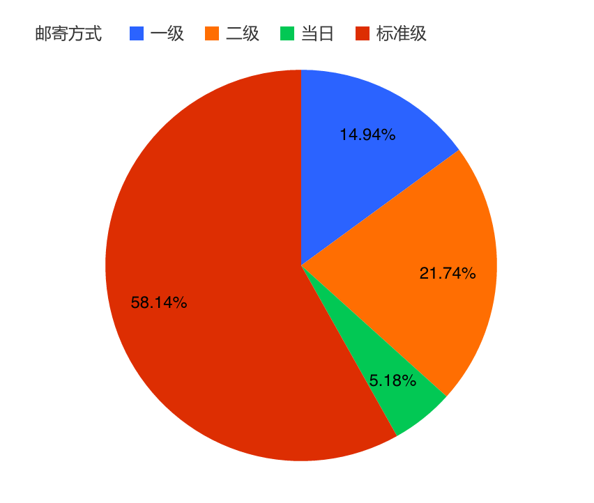 可以看到,每一个邮寄方式的扇形上显示的标签即为总额百分比的值。 标准级的销售额占总额的58.14%。