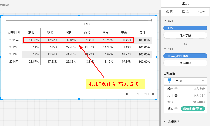 我们可能希望观察各地区销售额的占比,原始数据里并没有这样的信息,这种情况下可以借助表计算得到。如下图所示,我们使用了总额百分比表计算。