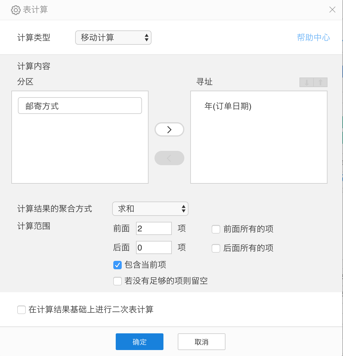 我们可以继续在这个移动计算上做表计算,只需要在可以图2的配置面板中最下面的复选框中打上勾,并在下面的二次表计算类型中做进一步的计算