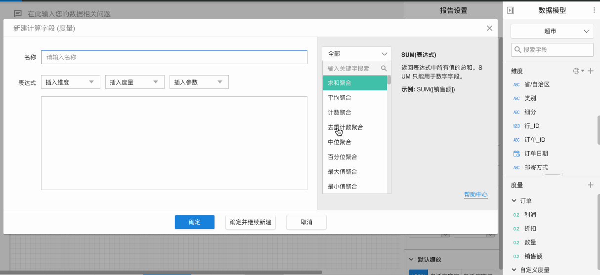 有时,数据表中的原始维度和度量并不满足我们的需求,因此平台提供了计算字段功能,利用各种函数新建新建字段。新建计算字段时能够快速复用上次计算字段的内容,实现继续创建计算字段。
