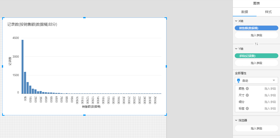 向数据面板中添加分桶维度时,每个数据桶都充当一个大小相等的容器,用于对特定的值范围汇总数据。将创建列或行标题,其中每个数据桶标签都指示分配给该数据桶的数字范围的下限。请注意包括下限。 比如在图表中,将数据桶字段拖入X轴,将记录数拖入Y轴, 就可以得到下图这样的直方图,来看到订单金额区间和数量的分布。