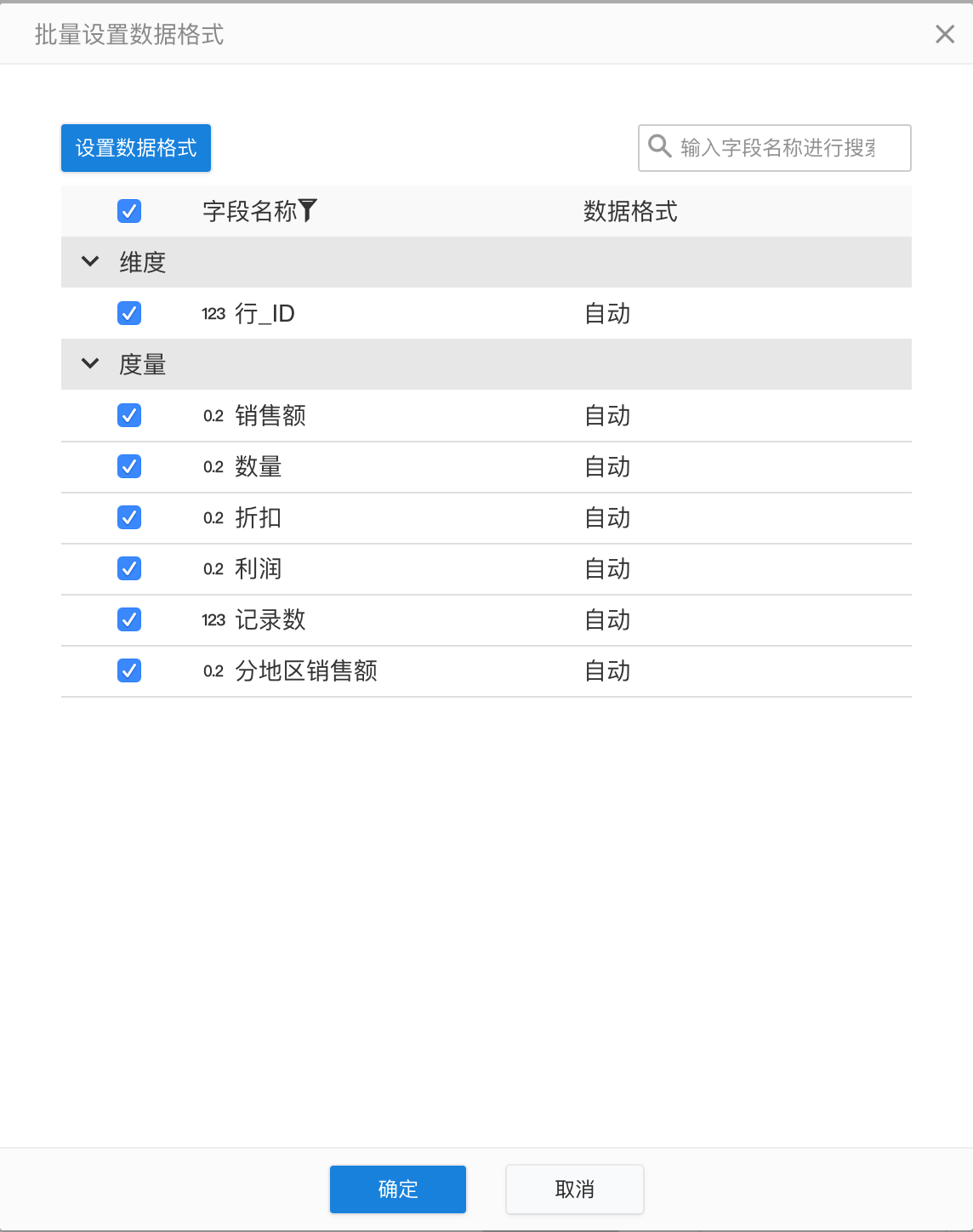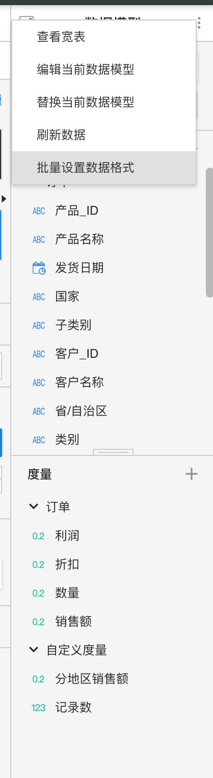 平台也支持批量设置数据格式,数据模型右侧的更多操作,选中批量设置数据格式,在设置面板可以选择需要批量设置的字段及数据类型。