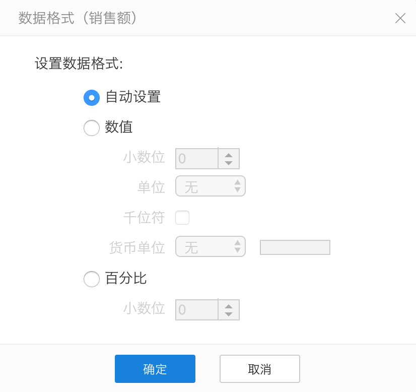 数据格式默认是自动,会选择最合适的格式。我们可以将其自定义为数值或百分比。在数值一栏中,我们可以设置数字小数的位数、数字的单位、数字千分符的显示、以及货币单位的显示。在百分比一栏中,我们可以将数字显示为百分比的形式,并指定其小数的位数。