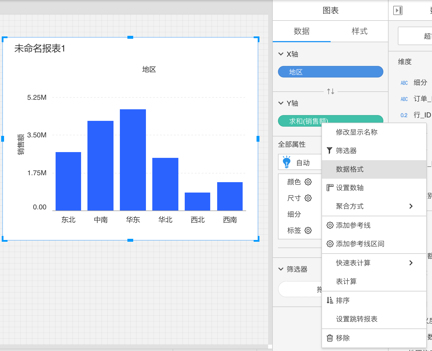如上图所示,我们已经使用地区字段与销售额字段制作出了一张柱状图。在柱状图的Y轴上,显示的销售额的格式类似于“3.50M”。我们可以更改数据格式。右单击求和(销售额)字段,选择数据格式,有如下的对话框出现。