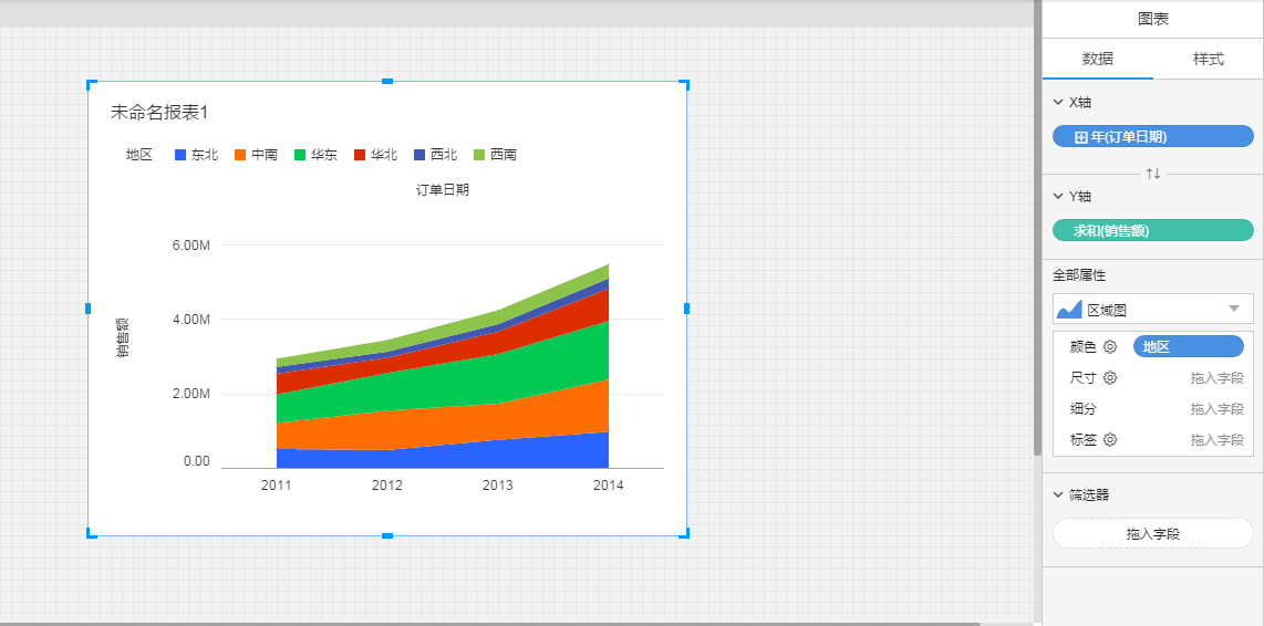 将涉及到3个字段:维度地区,维度订单日期,度量销售额