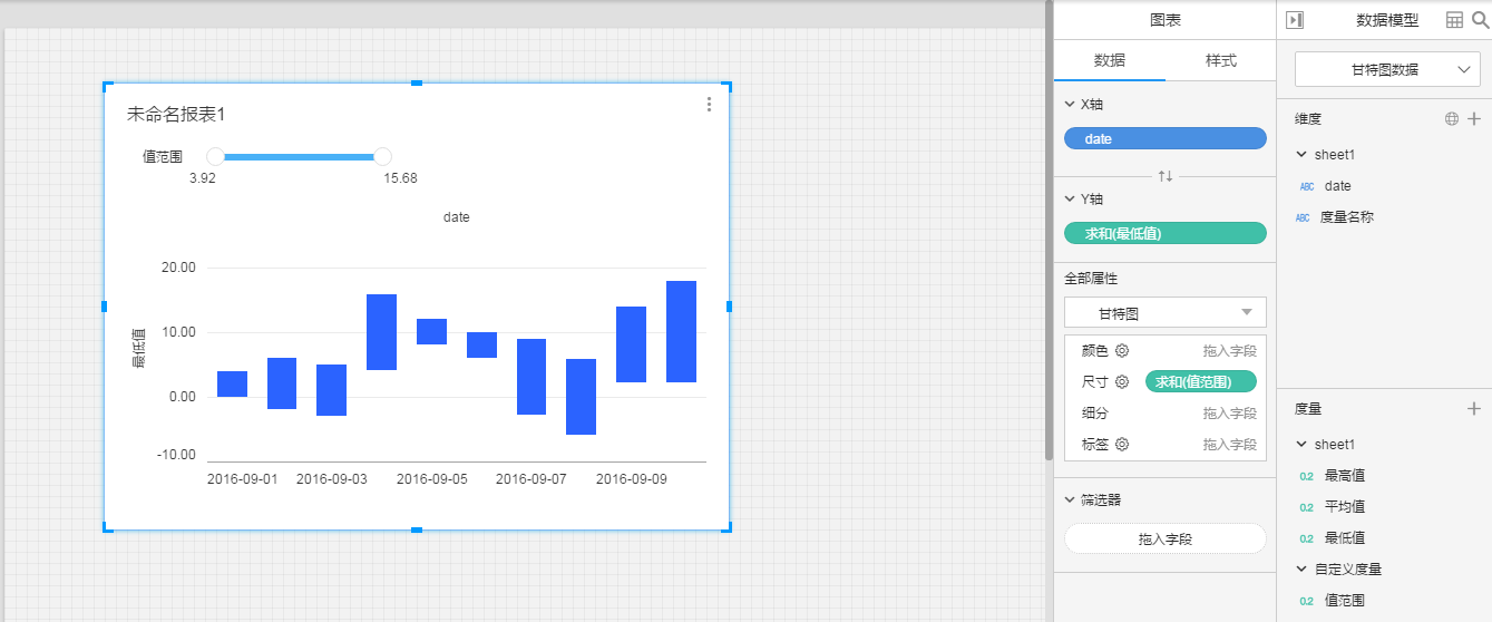 将涉及到3个字段: 维度日期,度量最低水平,度量最高水平