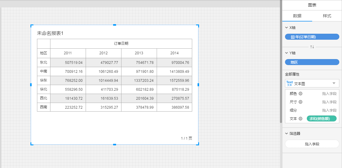 比如:各个年度、各地区的销售额情况