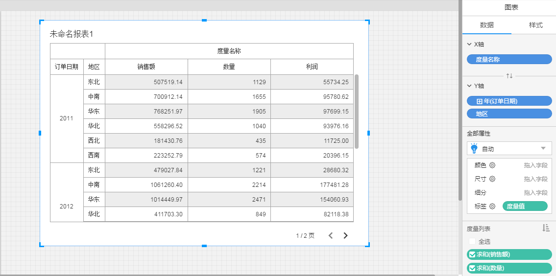将涉及到4个字段: 维度订单日期,维度地区,维度度量名称,度量度量值